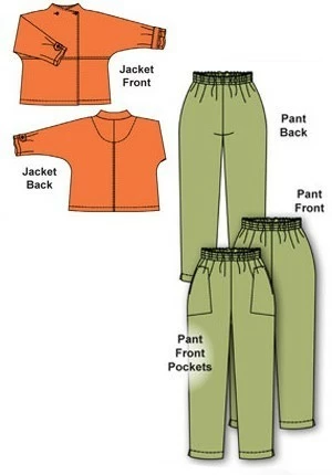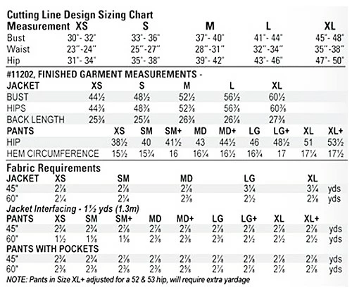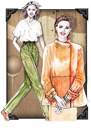 Patterns – Cutting Line Designs #11202 My Swing Set. Jacket: Flared loose swing fit. Mid-hip length. Front extends into crossover asymmetrical 2-button neck closing. Standing back collar. Center back seam. Horizontal above waist front seam. Full length cut on dolman sleeves with tabs and buttons. Topstitching and edge stitching throughout. Pants: Close fit through hips and thighs, tapered leg style with hem vent. New sizing charts to help with customized fitting. Elastic waistline with cut-on casing. Options include side seam pockets, waist darts for a more sleek fit. Customized front tilt waist instructions.ย