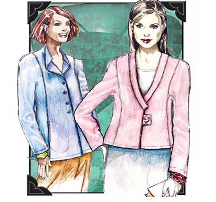 Jacket view A & B: Slimmer silhouette through fitted bust area with vertical seaming. Military princess seams front and back. Full-length, cut on dolman sleeves. Relaxed fit through hem. Edge stitching throughout. View A: Hem cropped at hip. Flat curved collar. One decorative button for closure. View B: Mid thigh length. Architectural folded collar. Four button closure. Sizes XS-SM-MD-LG-XL. Priced by the pattern.