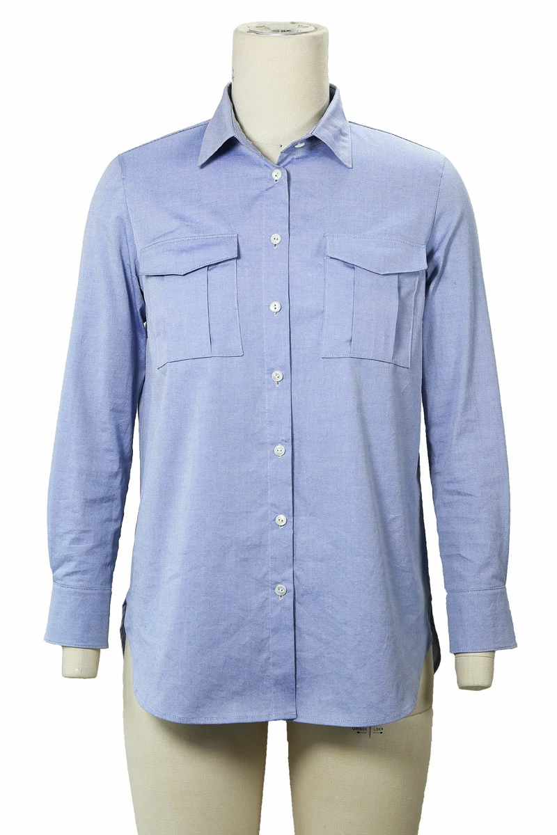 View B features a continuous (cut-on) placket and pleated pockets with concealed button flaps. ย