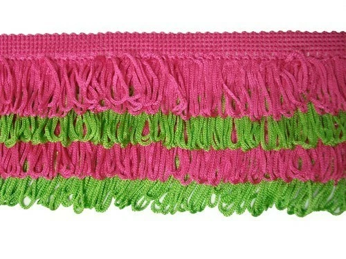 Rainbow Fringe – #I – Lime – Hot Pink. 3 1/2″ wide. 4 rows of fringe. 100% Rayon. Dry clean. Priced per yard.