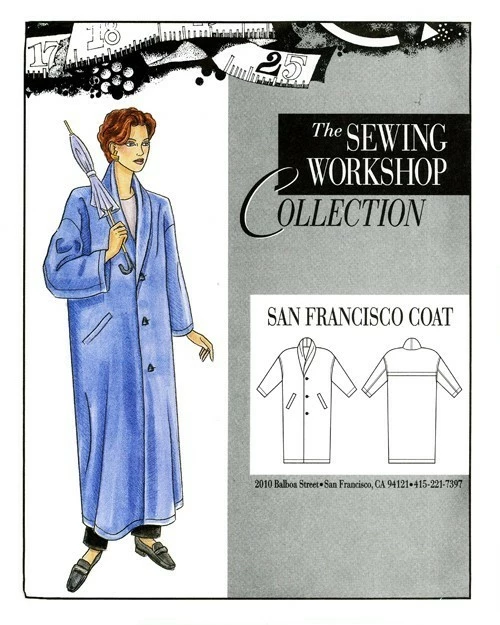 Sewing Workshop Collection – San Francisco Coatย pattern features a very loose-fitting, unlined coat, above ankle. ย Has a draped and tucked collar, single welt pockets, back shield, 3-button closing, long sleeves, ย & stitched hems. Sizes: S, M/L (8, 10, 12, 14, 16, 18). Priced per pattern.