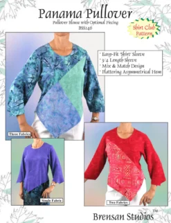 A Fundamental – Super Easy – Mix and Match pattern. Make this easy pull-over blouse in 1 fabric, 2 fabrics, or 3 fabrics. Flattering asymmetrical hemline – Fabulous in rayons, washed silks, linen blends, etc. Remember, this is a Shirt Club pattern, so you can interchange any of the sleeves from other Shirt Club Patterns. Combine the Panama Pull-Over with the Santiago Skirt for a complete Coordinated Outfit.